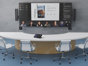 Bei QSC war eines der sehr interessanten Themen, das von Microsoft forcierte Thema “Spatial TEAMS“. Es geht dabei darum, das Meetingerlebnis bei Videokonferenzen so natürlich wie möglich zu gestalten. Beispielsweise hört man die Stimmen, je nachdem ob auf der linken oder rechten Seite gesprochen wird, auf der Gegenstelle dann auch aus dem linken oder rechten Lautsprecher. Der räumliche Eindruck soll zusätzlich noch durch den Einsatz von 21:9 Displays verbessert werden. Um das Szenario bestmöglich abbilden zu können ist es allerdings sehr wichtig, dass das Setup des Raumes auch entsprechend gestaltet wird.