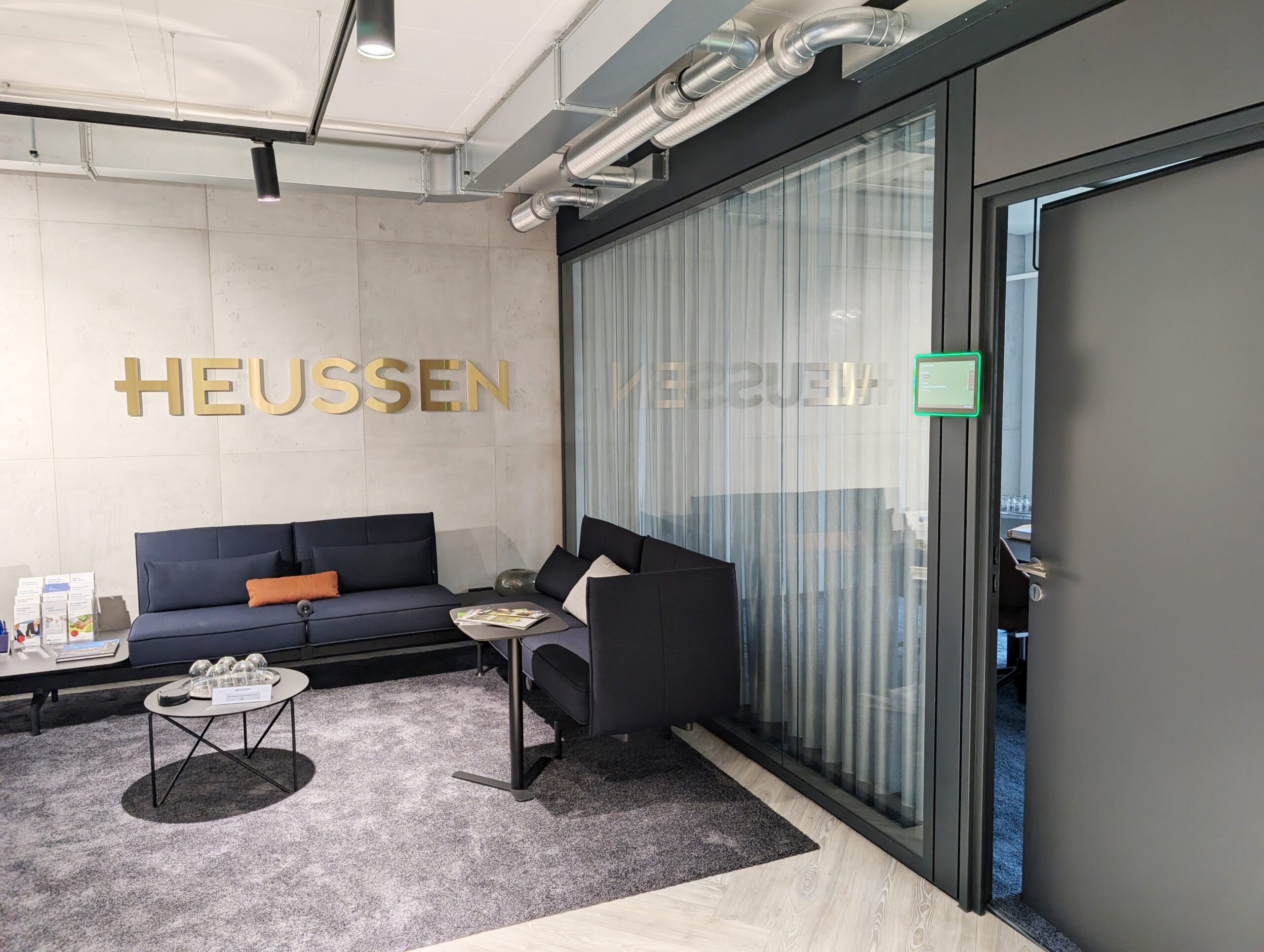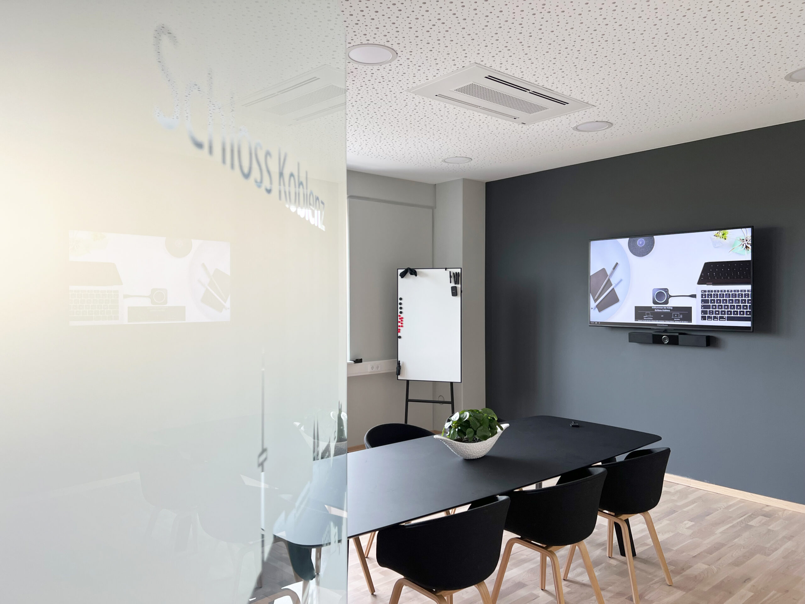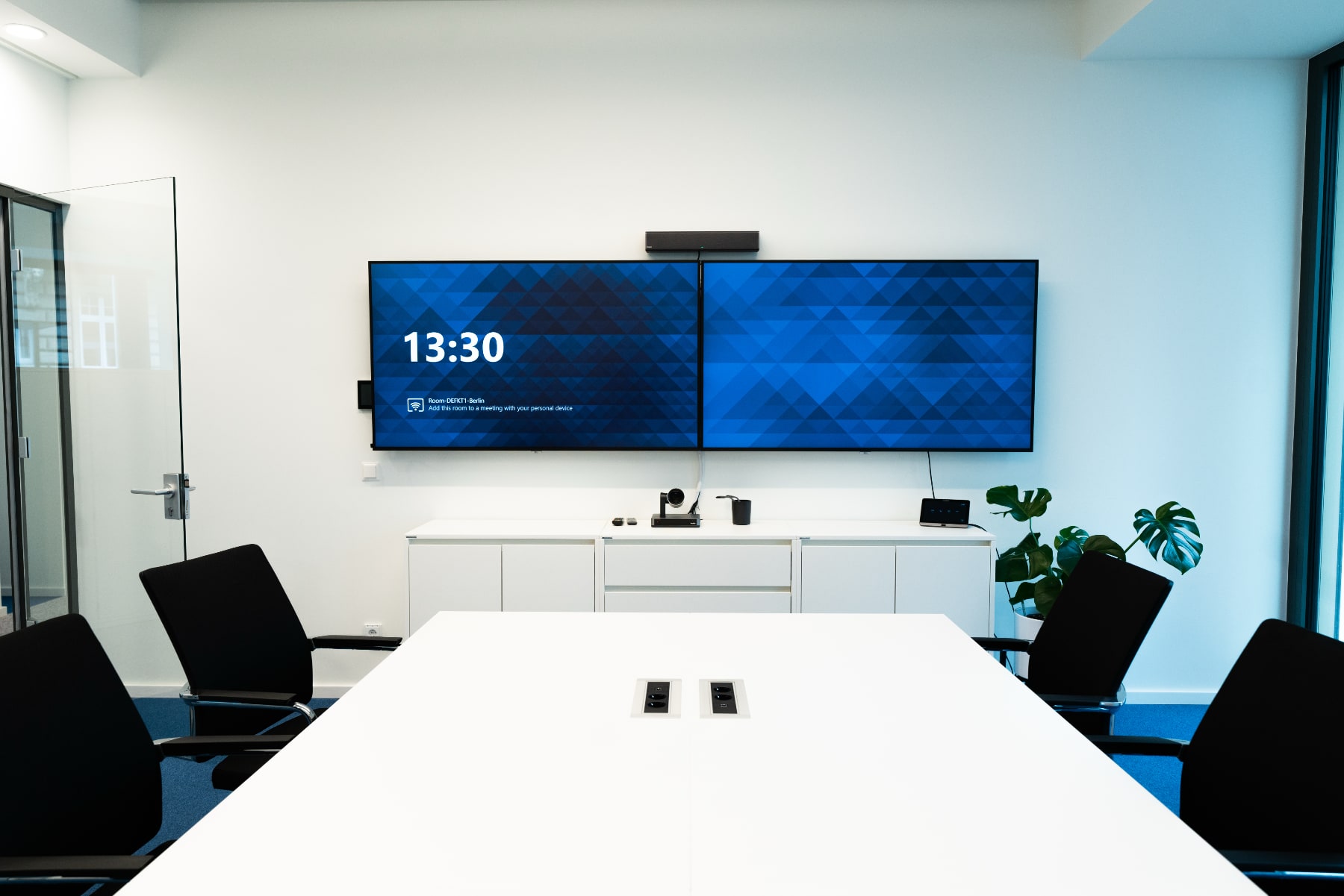 In zwei Räumen sorgen Videokonferenzlösungen für reibungslose Meetings. Während das GoBright Besucher- & Raumbuchungssystem ein smartes Office-Management perfekt unterstützt