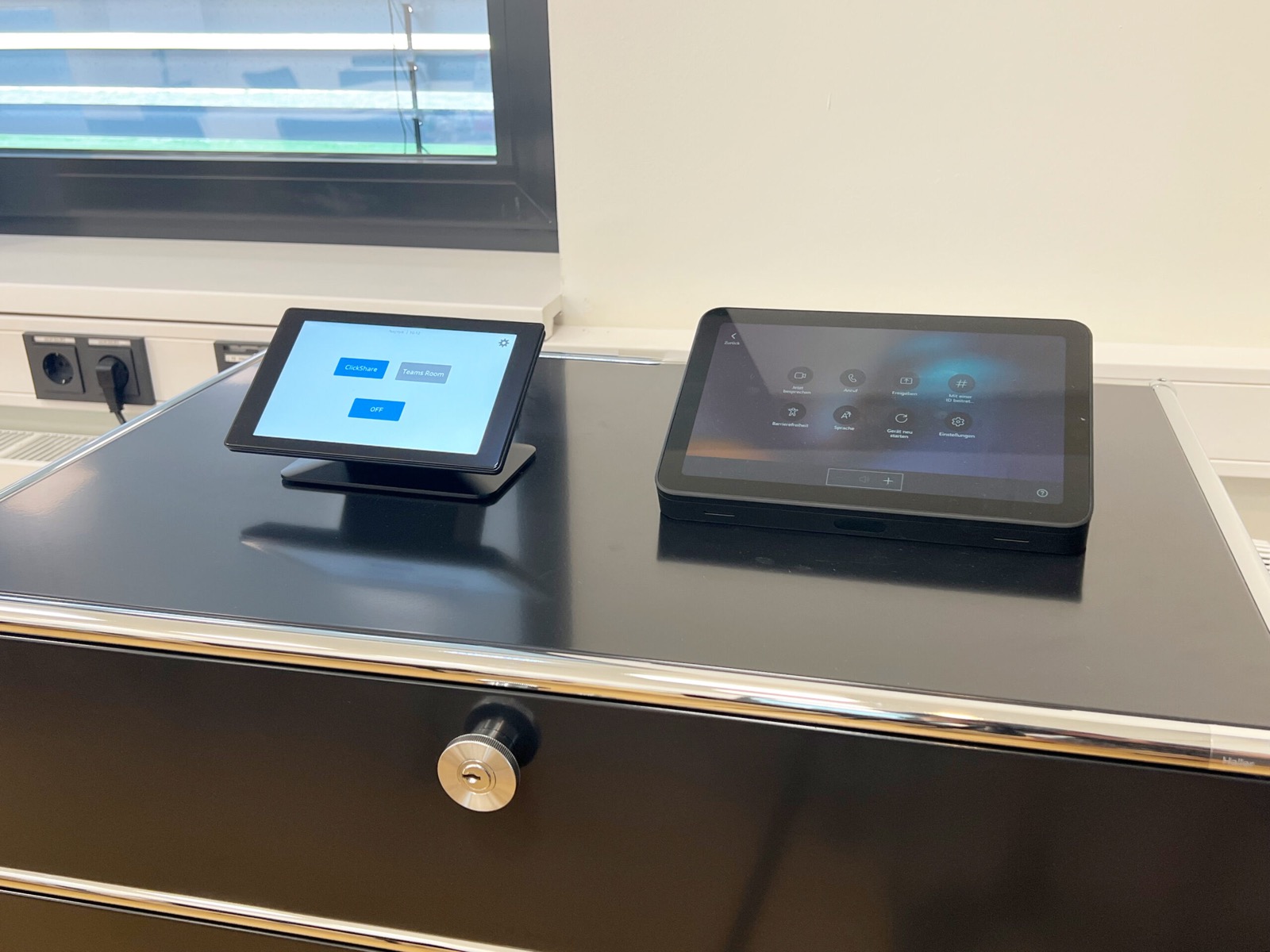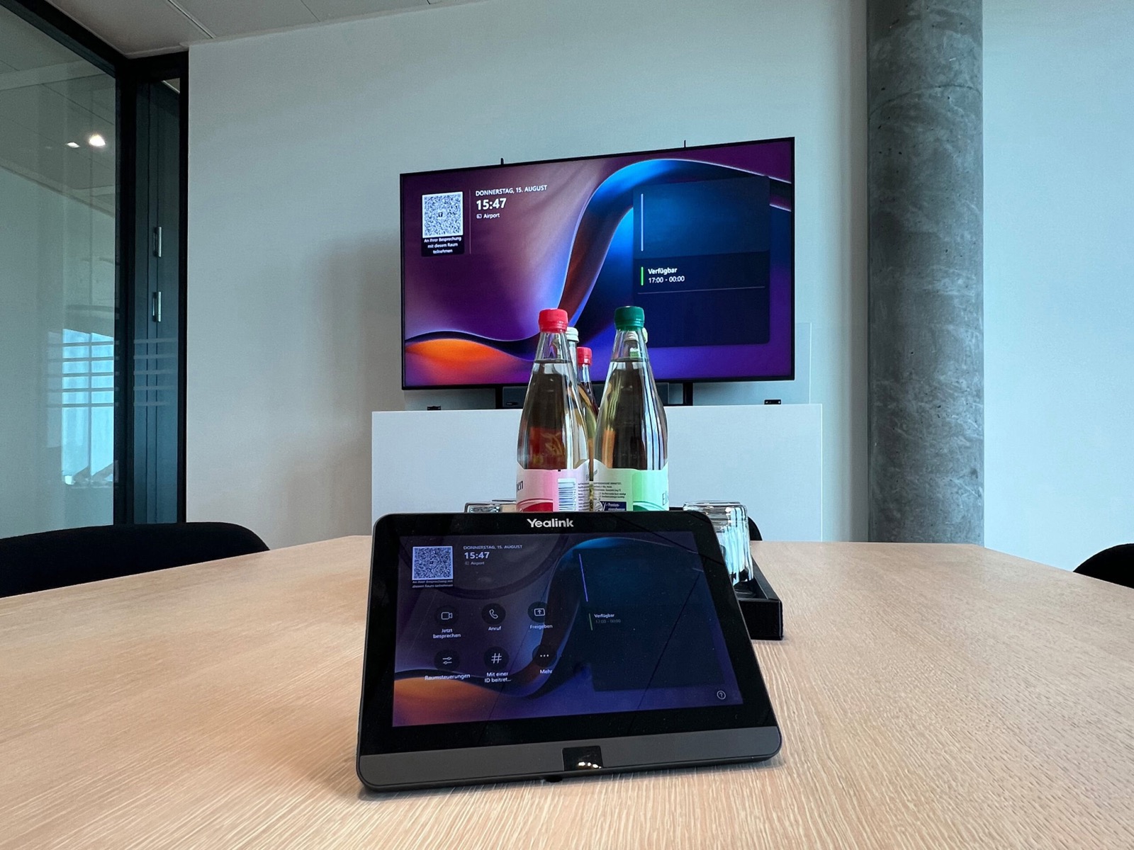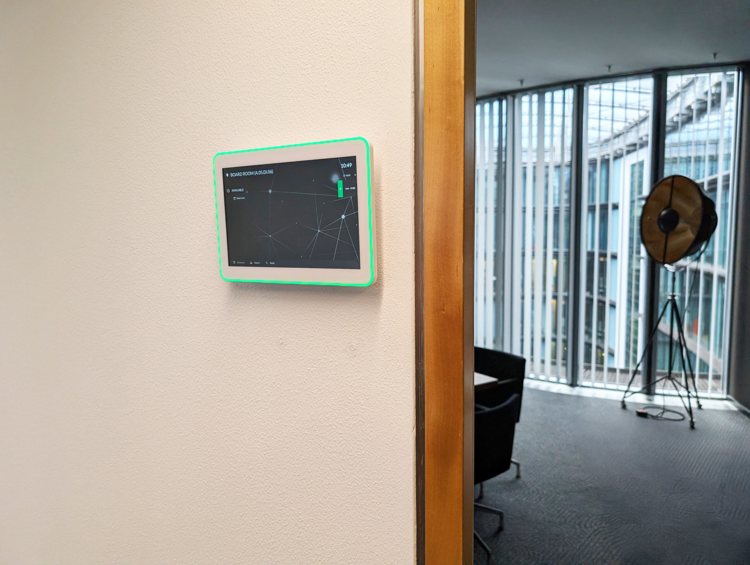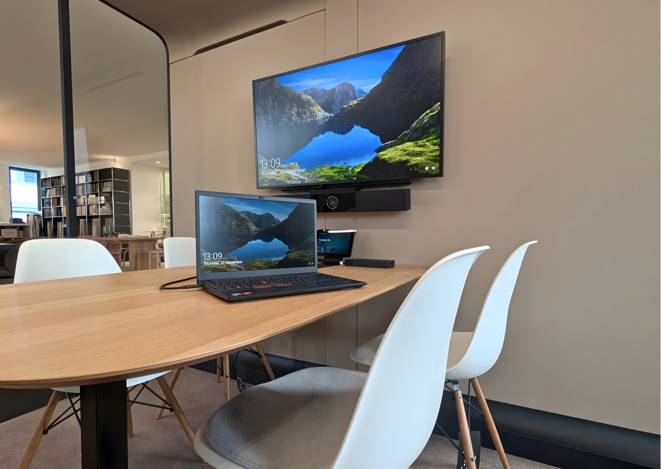 In zwei Räumen sorgen Videokonferenzlösungen für reibungslose Meetings. Während das GoBright Besucher- & Raumbuchungssystem ein smartes Office-Management perfekt unterstützt